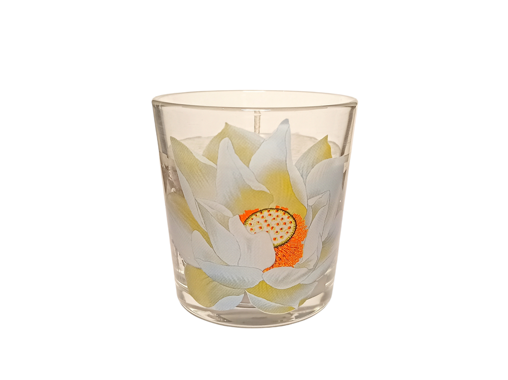 Ароматическая свеча в стакане с изобраением и ароматом дымного лотоса. Дымный лотос это восточное благовоние которое делают из высушенного плодолистника-коробочки лотоса. Аромат очень яркий, пряный, стойкий, восточный. Достаточно зажигать свечу на 20 минут чтобы ароматизировать пространство 20 метров. Подойдет для больших пространств площадью от 20до 40 метров. Идеален для студий медитаций, йога центров, клубов восточных практик. Степерь интенсивности аромата на 3,5 по 5 бальной шкале. После того как свеча прогорит, стакан можно использовать как подсвечник. Нанесение лотоса несмываемое!