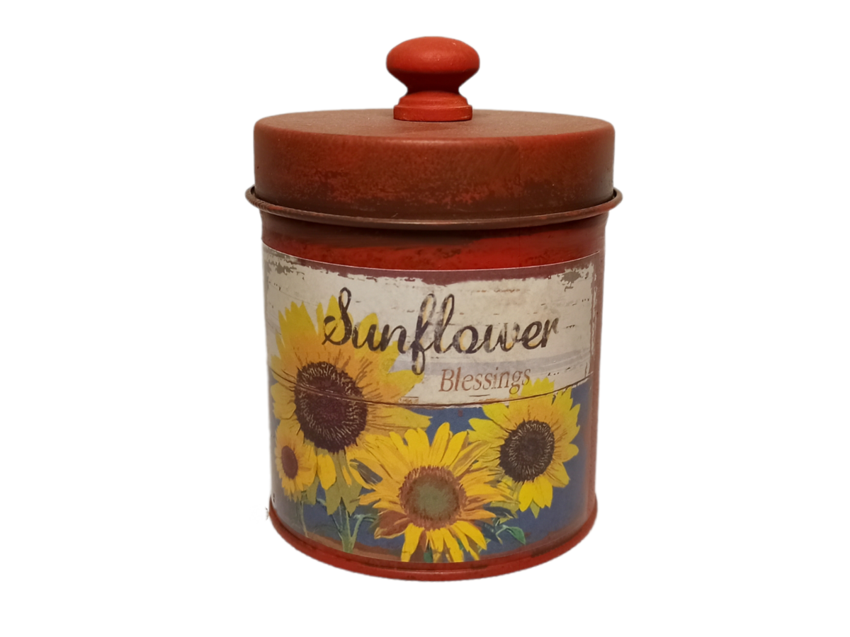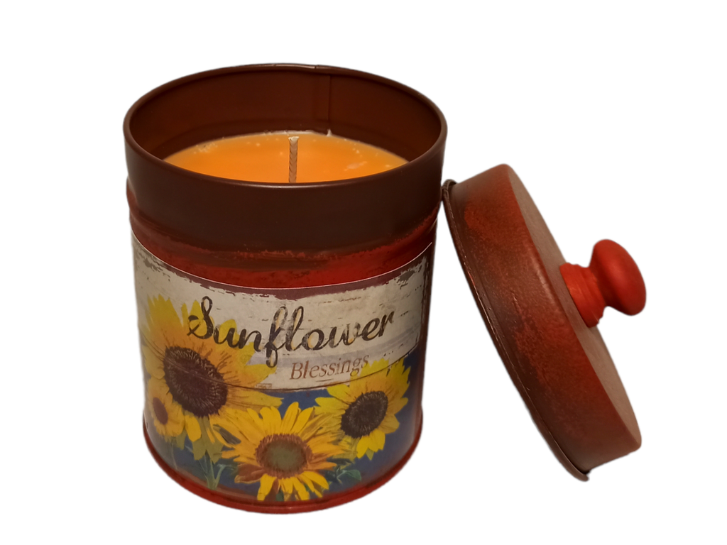 Металлическая банка с металлической крышкой, цвета ржавого металла, отлично впишется в осенний интерьер 2022 года. Подойдет в качество декора кухонной и столовой зоны. А аромат тыквенного пирога, наполнит дом уютом и теплом. Нанесение - наклейка с изображением подсолнухов и надписью Sunflower. Степень ароматизации на 3,5 по 5 бальной шкале.