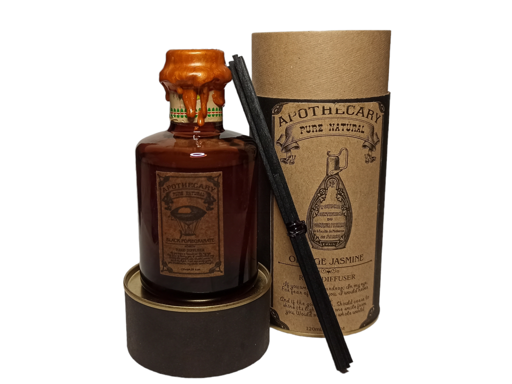 Диффузор с ароматом Оранж-Жасмин во флаконе из темного стекла и с запаянной сургучом, крышкой. Набор выполнен в стилистике европейских аптек 18 века. Черный шрифт на крафтовой бумаге, искусственно состаренная этикетка, сургуч, и главное, даже саму ароматическую жидкость, сделали слегка мутной, похожей на эссенцию алхимика. Аромат маскусный, в начале, преобладают нотки копченой цедры цитрусовых, центральная нота сладкого и стойкого жасмина, шлейфовая нота табака и лакрицы. Такой ароматизатор идеально впишется в "мужское пространство" - квартиру, лофт студию, барбершоп, бильярдную, бар, кабинет. Срок службы ароматизатора 1,5 месяца. Интенсивность и срок службы диффузора можно регулировать количеством фибровых палочек. В комплекте 8 штук. Упакован в черный тубус 18х8 см. После использования, флакон можно использовать как вазу декантер под другие ароматы.