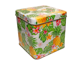 Металлическая банка с крышкой для сыпущих продуктов из жести. На банке нанесение, принт в виде тропических листьев и ананаса.
