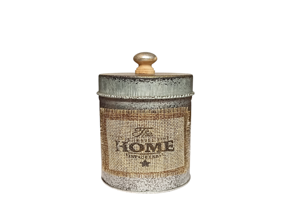 Банка с крышкой из оцинкованного металла для домашних мелочей. Стильный декор для дома в стиле фарм, рустик, кантри, лофт, винтаж. На банке текстильная бирка с надписью HOME.