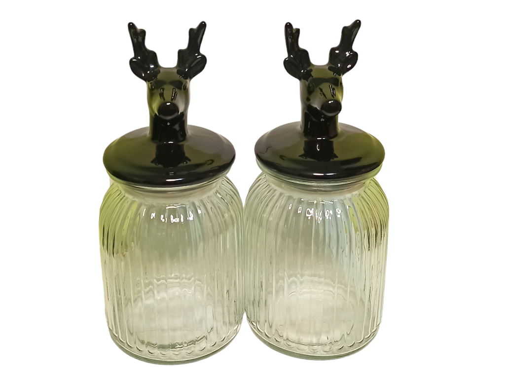 Набор из двух стеклянных банок для хранения с керамическими крышками в форме головы оленя. Комплект 2 банки.