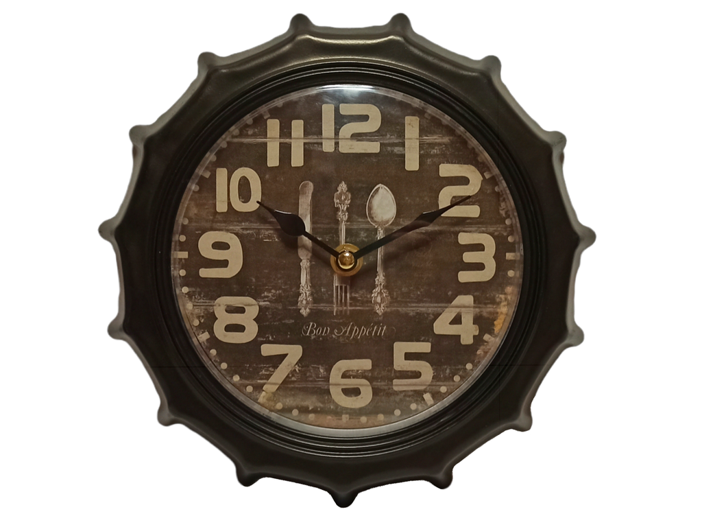 Часы в фоме металлической пробки от бутылки, диаметром 22 см. Стилестичеки созданы для использования и декора: кухни, бара, столовой зоны, барбершопа, кальянной или бильярдой. Часы выполнены из металла, имеют кварцевый механизм, работающий от одной батарейки типа AA 1,5 V (в комплект не входит). Циферблат выполнен в стилистике состаренной поверхности с потёртостями, под деревянные доски, циферблатом и принтом с вилкой, ложкой и ножом. Внизу имеется надпись Bon Appetit, что сфранцузского языка, переводитка как: приятного аппетита. Цвет часов: чрный.