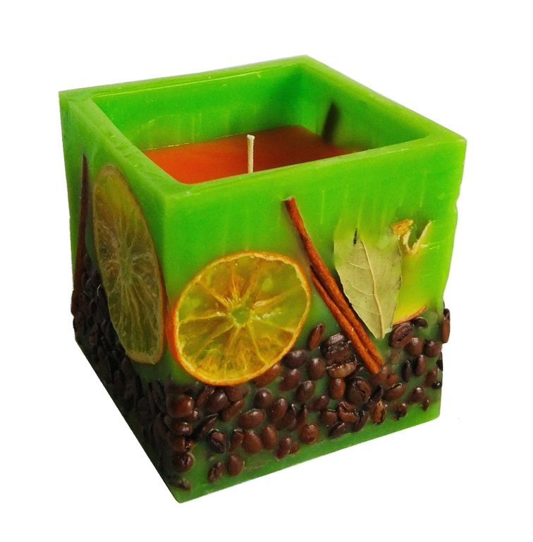 Квадратная декоративная свеча с декором из сухих фруктов, кофе и палочек корицы. Стенки свечи рассеивают свет от пламени а нежный аромат сладких фруктов, ароматизирует пространство. Наружный цвет свечи зеленый, внутри оранжевый или желтый.