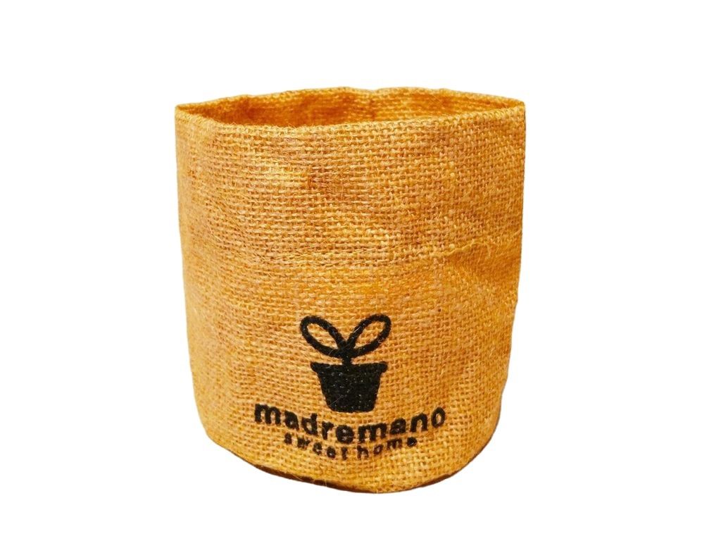 Чехол из тонкого джутового полотна с печатью в виде надписи "Madremano sweet home". Чехол используют чтобы освежить интерьер и придать ему новые стили. Для этого достаточно надеть чехол на старый горшок или кашпо с цветком.