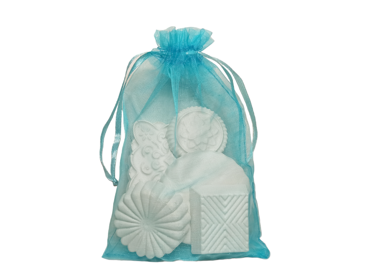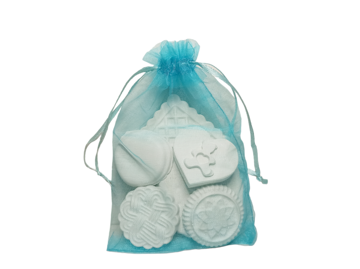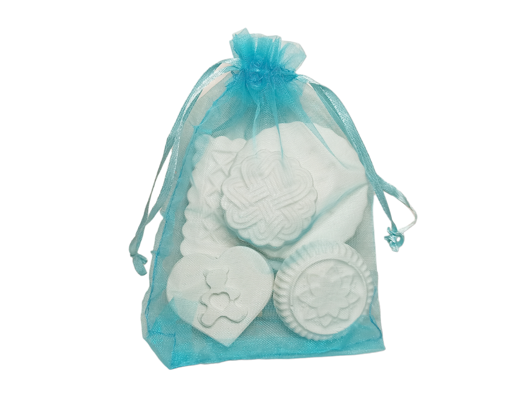 Наборы флорентийского саше в голубых мешочках. В каждый набор входят различные виды печенья, шоколада и конфет. Наполнение каждого мешочка 5-6 саше. Круглые большие печенья, квадратные большие печенья, средние печенья, конфеты лунный пряник, конфеты грильяж, фигурные шоколадки сердечки, квадратные шоколадные конфеты и миниатюрные песочные печенья капли. Все изделия выполнены из флорентийского саше на основе мраморной крошки. Не оставляют следы на руках, отлично впитывают любые ароматы, долго держат аромат. Ниже представлены фотографии с остальными видами наполнения в ассортименте.