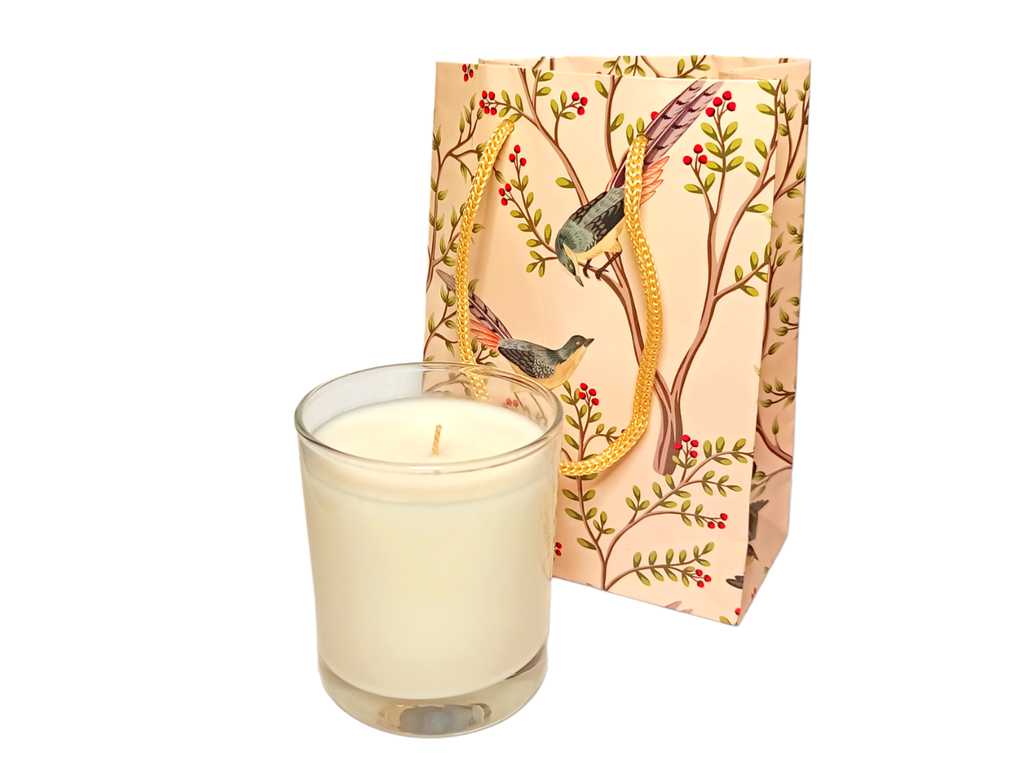 Свеча поставляется в подарочном пакете с птицами в райском саду как на фото.