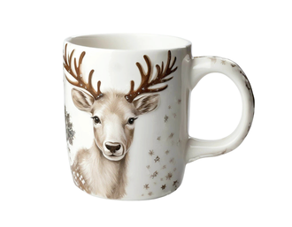 Кружка новогодняя, керамическая, с изображением Северного оленя и барельефными вставками. Рога оленя выпирают над поверхностью кружки. Объём 300 мл. Кружка упакована в белую, картонную коробку с логотипом TheVitrine. На дне кружки, несмываемый штамп производителя - TheVitrine. Эксклюзивная коллекция Зима 2025.