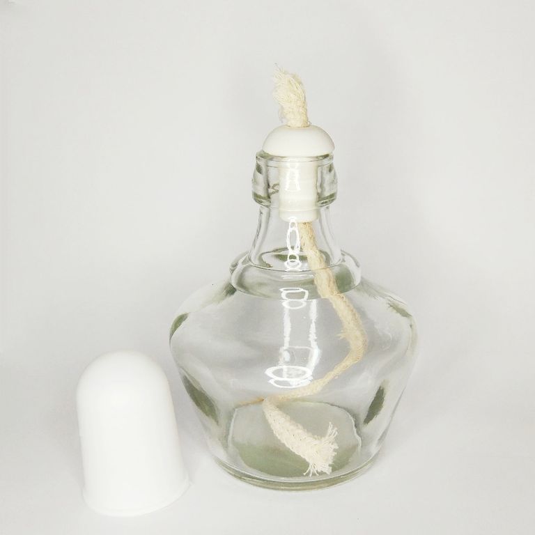 Масляная лампа в виде спиртовки работает как от масла для ламп, так и от спирта. В комплекте идёт толстый хлопковый фитиль, керамический держатель и пластиковый колпачок для тушения лампы.