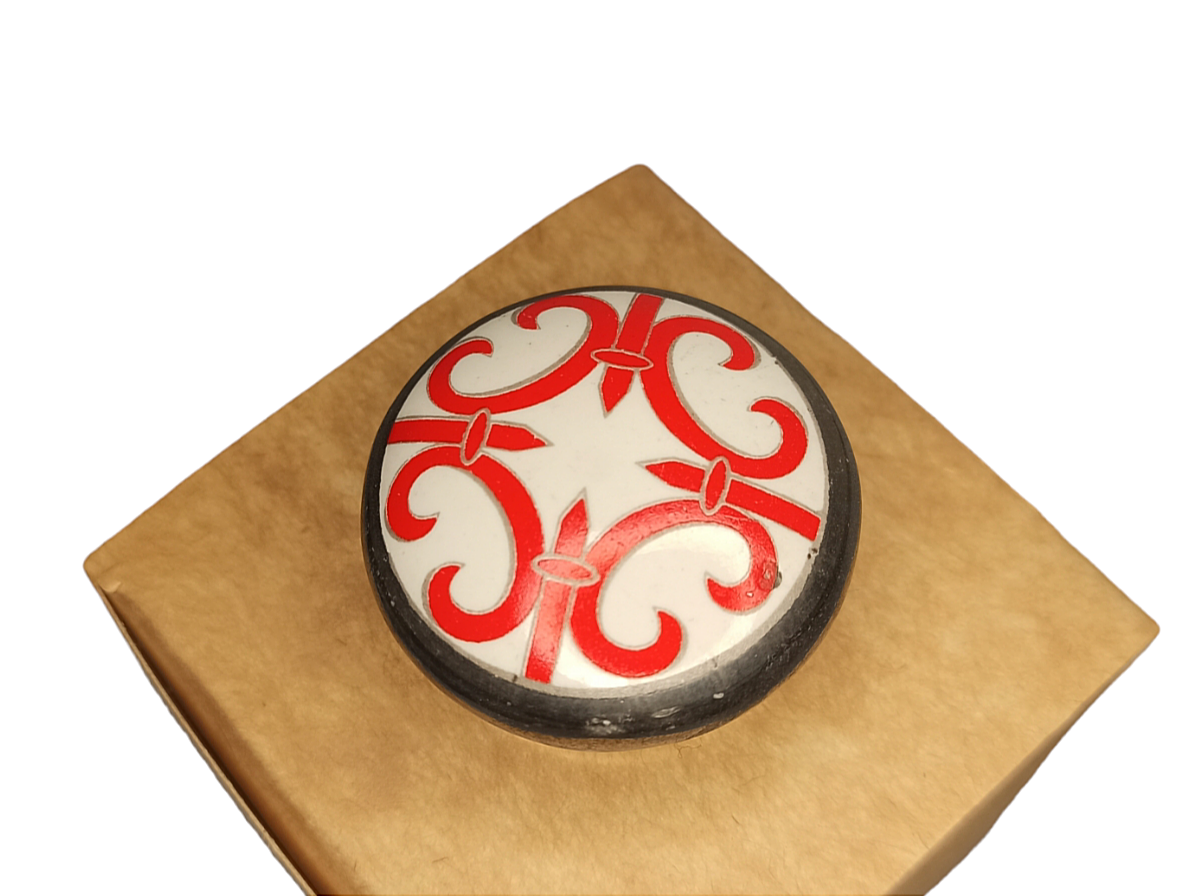 Металическая ручка с красно-белым, винтажным нанесением, украсит вашу мебель и добавит ей восточных акцентов. Ручка стилизована под орнамент красного города, и речь, конечно же, про Марракеш, в честь чего и названа эта декоративная ручка. Подойдет для выдвижной полки, крышки шкатулки, комода с эклектичным дизайном, и даже как прикрученная вешалка для кухонных полотенец и салфеток, на кухне или к марроканскому шестигранному столику.
