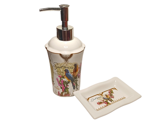 Комлект керамический, для ванны, состоящий из дозатора для жидкого мыла и мыльницы для брускового мыла, коллекция Птицы.