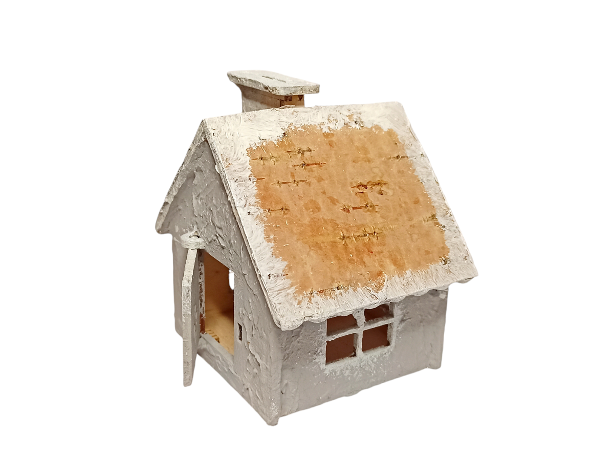 Декор в виде рустикального новогоднего домика-шале с крышей из березовой коры и открывающейся дверцей. Фактура стен, двери, крыши и трубы выполнена в стиле рустик. Основной цвет серый. Крыша с белой краской имитирующей снег. Можно использовать как подсвечник, используя светодиодную ленту на пальчиковых батарейках, или в качестве части рождественской композиции и новогоднего декора для дома.
