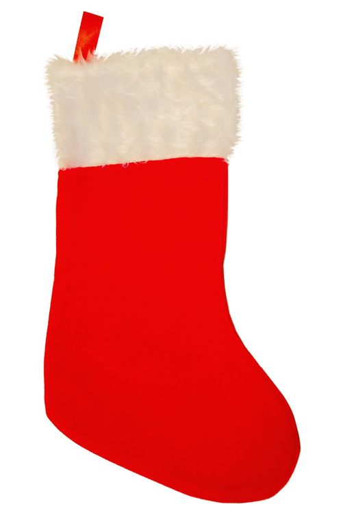 Классический новогодний носок (чулок) красного цвета, с меховым кантом. Служит как элемент для сладких подарков. Чулок со сладостями вешают на камин или кладут под елку.