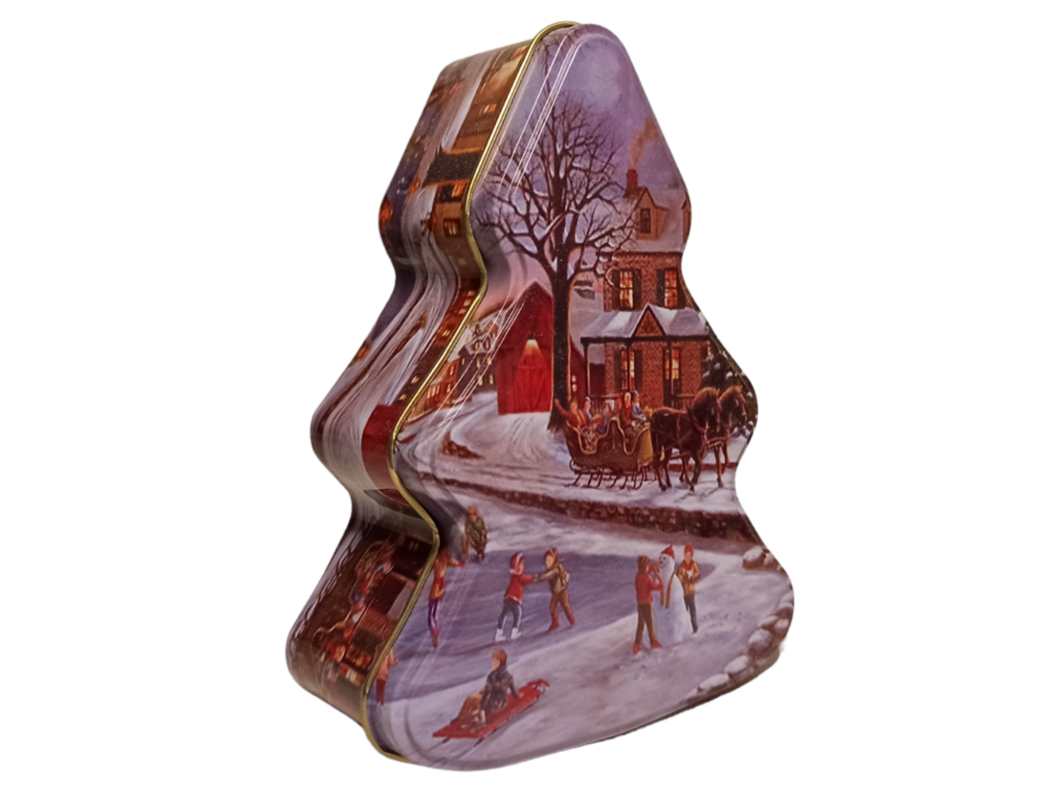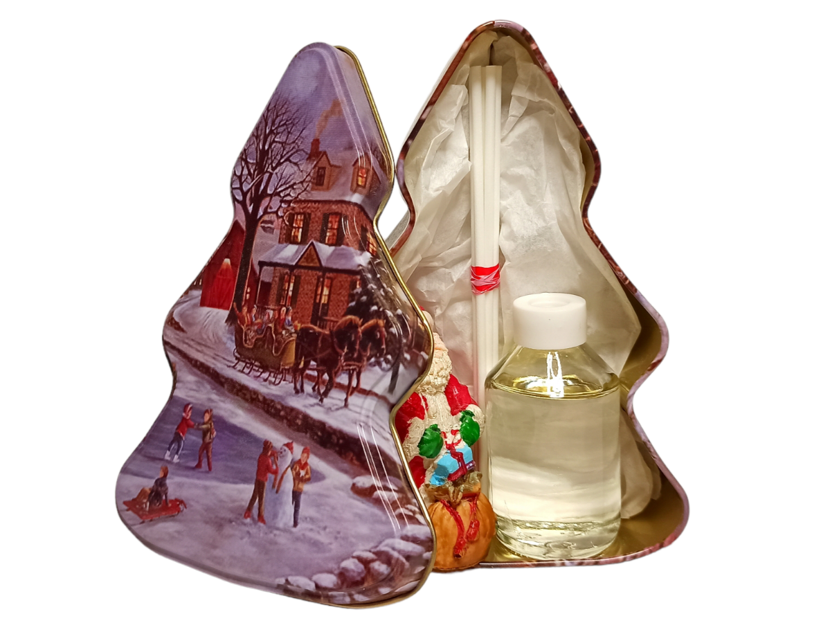 Подарочный новогодний набор в жестяной коробке в форме елки с новогодними мотивами. Внутри коробки лежит диффузор 50 мл с белыми фибровыми палочками и ароматом "Морозный лес", а так же фигурка Дед Мороза в красном кафтане с мешком подарков. Такой новогодний подарок, идеально подойдёт в качестве знака внимания коллеге, дружеского презента, рождественского сувенира партнёру в офис.