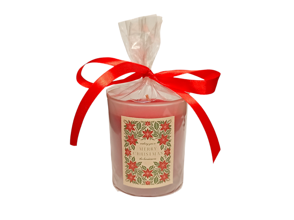 Ароматическая свеча в матовом стакане с рождественским ароматом Пуансеттия и красные ягоды. Свеча упкована в подарочный пакет с бантиком и наклейкой как на фото. На этикетке изображены цветки Пуансеттии и надпись "Merry Christmas". Объём свечной массы 170 мл.