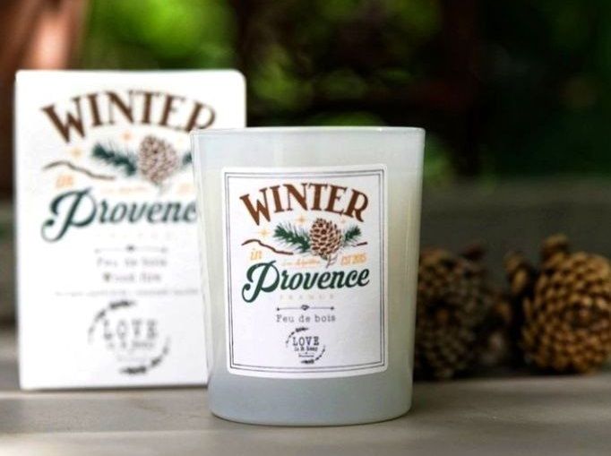 Ароматическая новогодняя свеча с ароматом цветов Прованса и хвои. Матовый стакан с наклейкой и фирменная коробочка белого цвета.