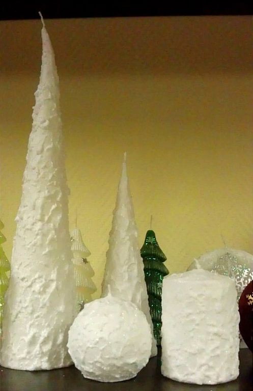 Свеча в виде новогоднего конуса в снегу. Еще это напоминает оледеневшую, заснеженную сосульку, или ёлку полностью покрытую снегом. Такие высокие свечи в новогоднем стиле, удобно ставить на новогодний стол, вместо классических канделябров с длинными свечами, ими удобно декорировать камин, подоконники и украшать интерьеры и витрины магазинов и цветочных салонов. Новогодние свечи конусы, отлично впишутся в качестве комплектующих или акцентного декора для больших рождественских композиций и диорам.