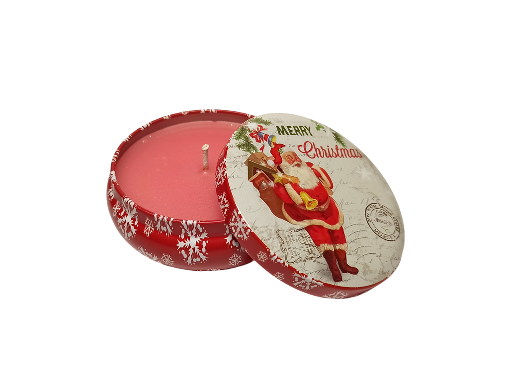 Ароматизированная новогодняя свеча в красной банке с крышкой и изображением Санта Клауса. Надпись на банке Merry Christmas. Аромат: Апельсин с корицей.