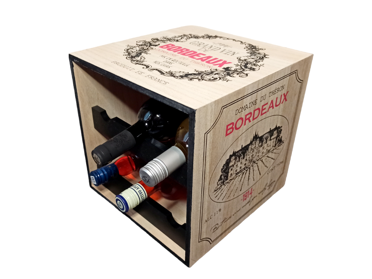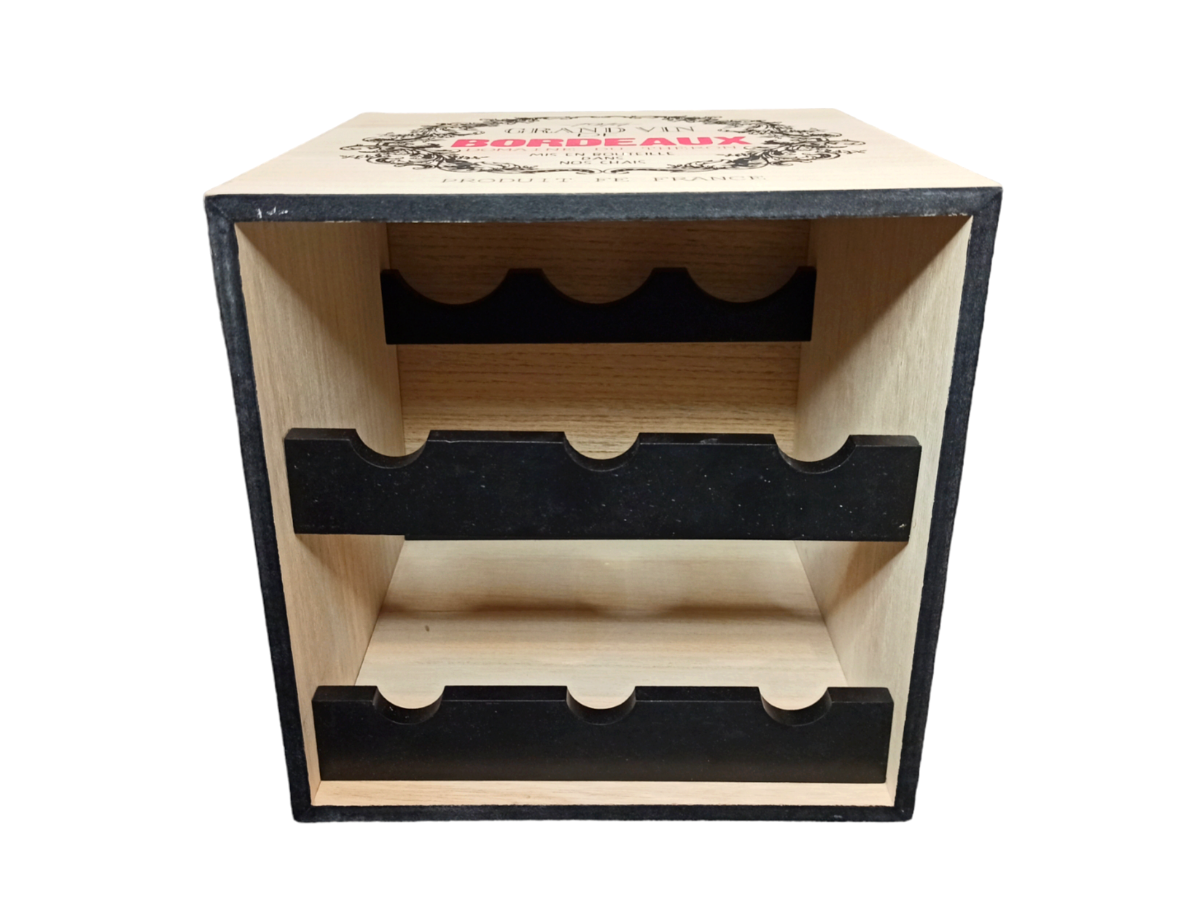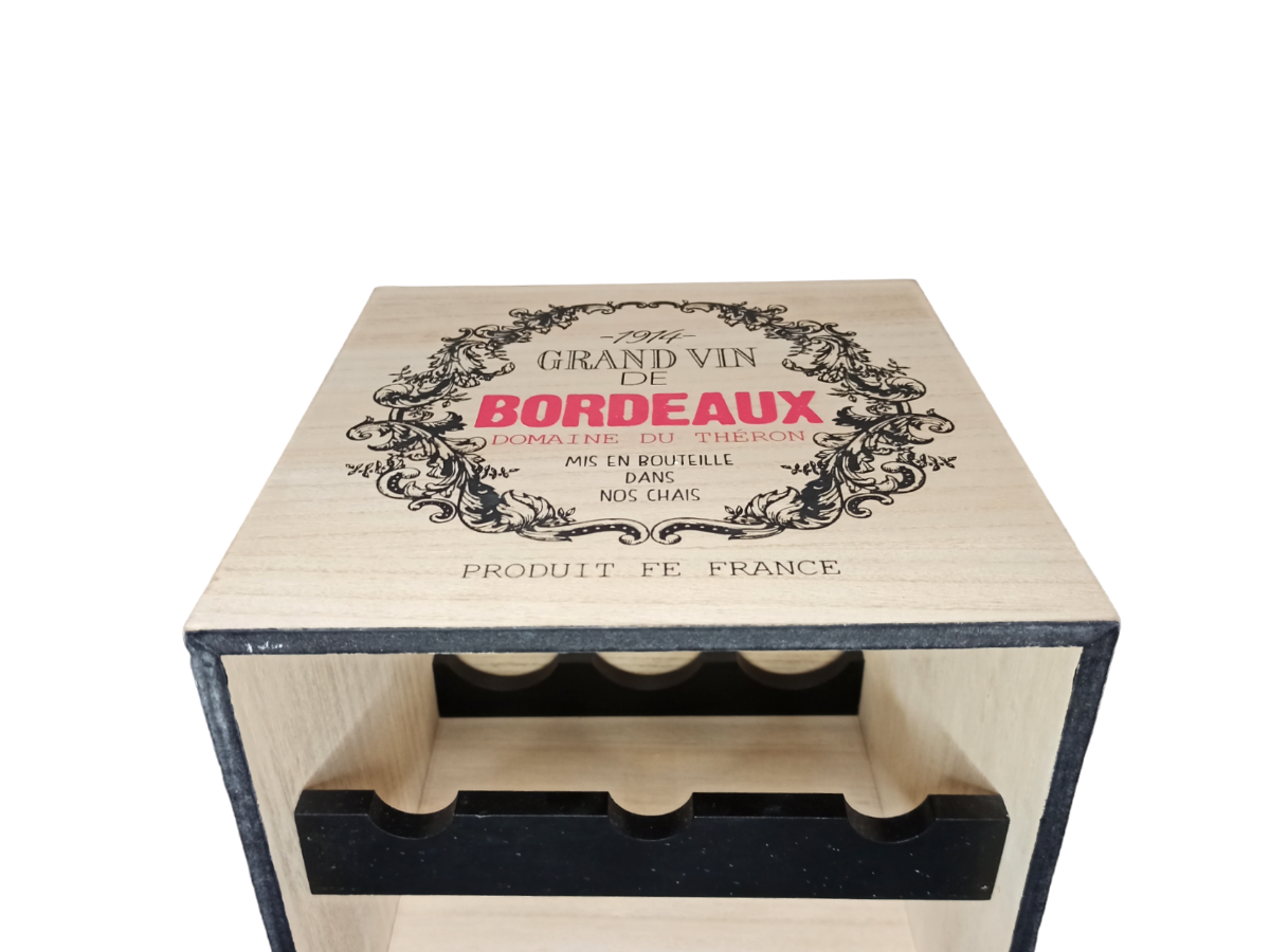 Трехстороннее нанесение логотипа стилизованного под винную этикетку с надписью Bordeaux 1914 и изображением старинного замка Шато. Искусственно состаренные винтажные потертости на углах. Подходит для хранения классических винных бутылок серии бордо, а так же схожих по длине и диаметру бутылок с прочими алкогольными напитками. Вместимость 6 бутылок.