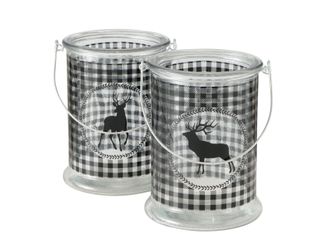 Стеклянный подсвечник фонарь с металлической ручкой и нанесением новогоднего принта с Оленем. Два вида подсвечника как на фото. Различия только в изображениях Оленей. Подсвечник подходит для большинства свечей в стаканах и свечей столбиков, диаметром до 10 см.