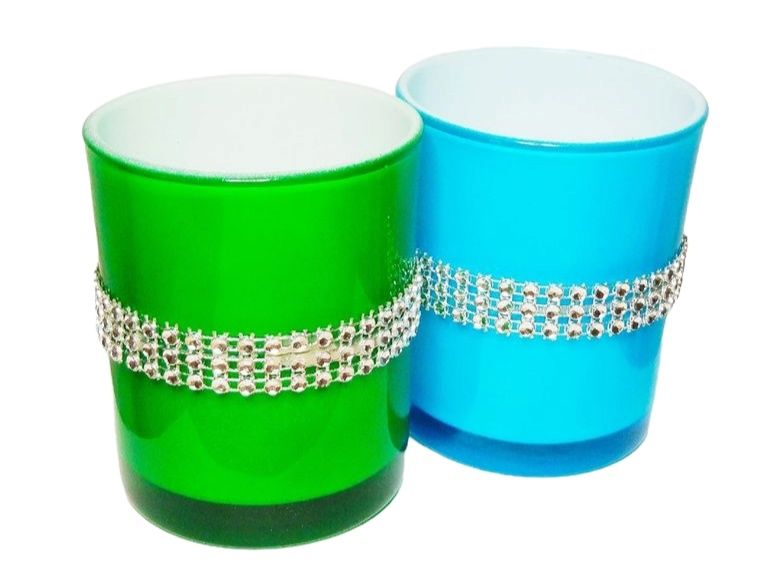 Подсвенчики зеленого и голубого цвета с декором из лент кристалов. Внутри стаканы белого цвета для более плавного рассеивания света от свечи. Цена указана за комплект из двух стаканов. При заказе кладем голубые и зеленые в равных пропорциях. При заказе одного конкретного цвета, наценка.