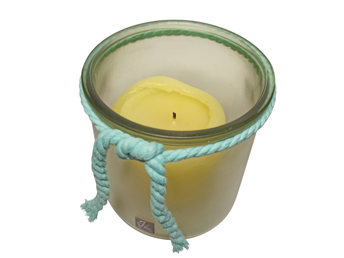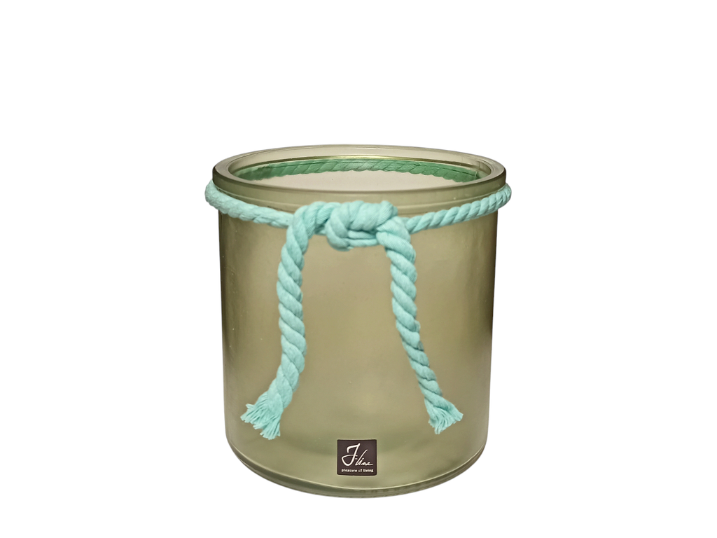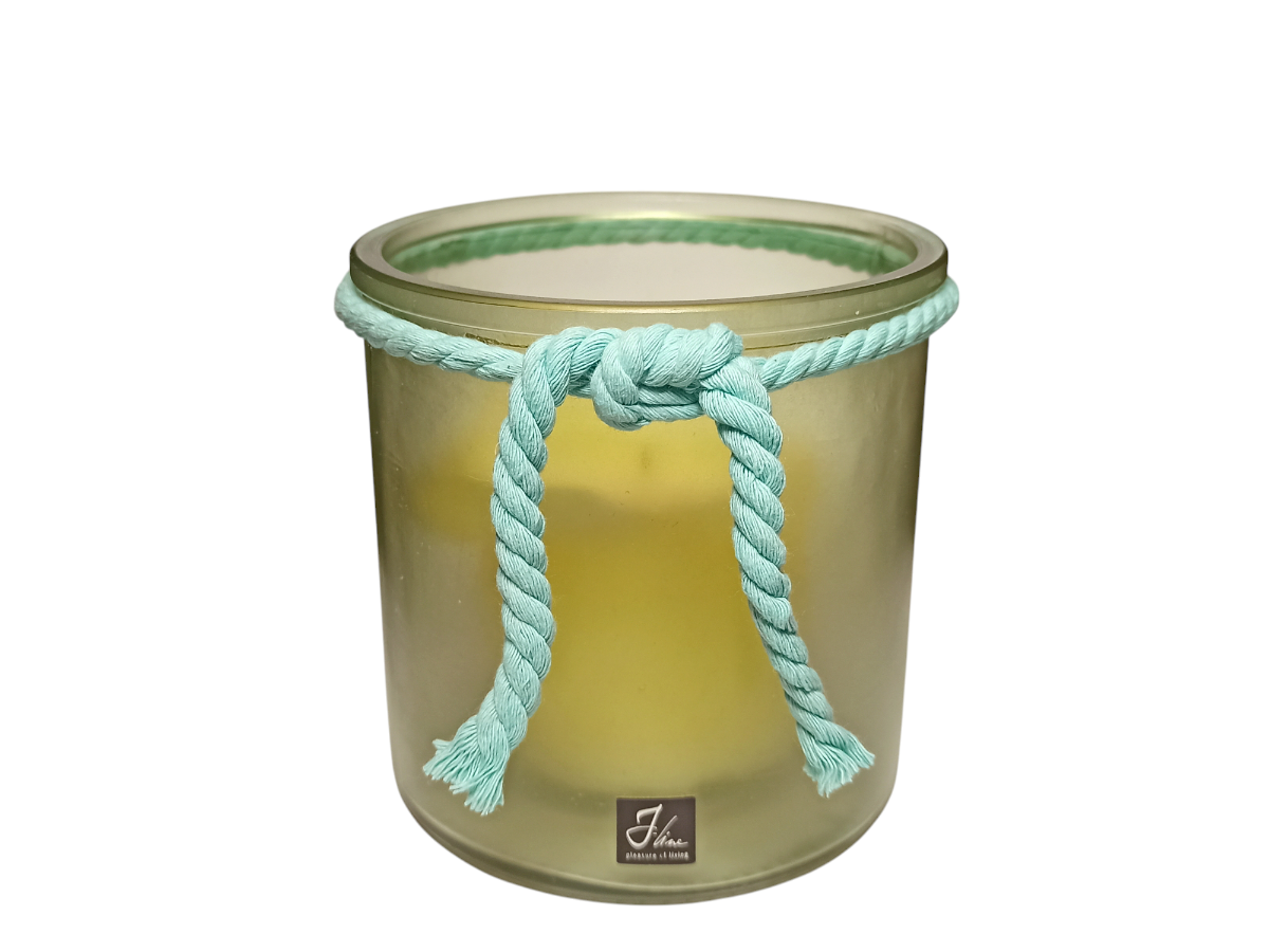 Подсвечник из матового стекла с зеленым оттенком от бренда J-Line, для свечей столбиков. Так же, может быть использован как ваза для цветов. Подсвечник украшен голубой, хлопковой верёвкой. Подсвечник вмещает в себя все свечи столбики и цилиндры рустик, диаметром от 4 до 8 см. Внутренний диаметр вазы составляет 10,5 см. Для примера, ниже, мы сфотографировали подсвечник со свечой столбиком, диаметром 7 см и высотой 9 см. Благодаря матовой поверхности стекла, при горении, свет от пламени свечи плавно рассеивается.