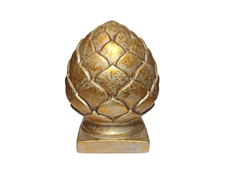 Декоративное украшение для сада, загородного дома и квартиры в виде керамического артишока с золотым напылением. Артишок выполнен в рустикальном, винтажном стиле, с искуственным состариванием золотой облупившейся краски. Внутри полый. Устанавливается на садовых обелисках, поручнях террасного ограждения, кирпичных заборах, используется как пресс для бумаг в кабинете или при работе на открытом воздухе в саду. Служит декором для теплиц и оранжерей в английском стиле, или просто в качестве респектабельного декора в загородных домах и квартирах. Не боится воды и дождей.