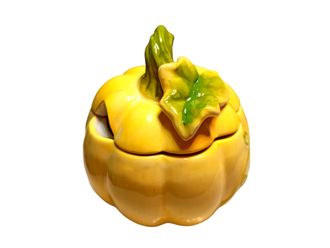 Керамическая сахарница в виде желтой тыквы с зеленым хвостиком сверху. Отверстие для ложечки. Можно использовать для храниения других специй и пряностей, соли, сухих трав. Упакована в глянцевую коробку с изображением тыкв.