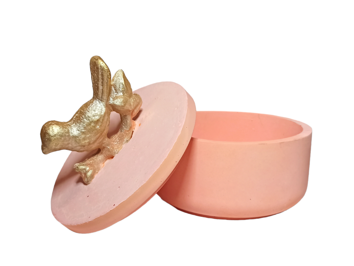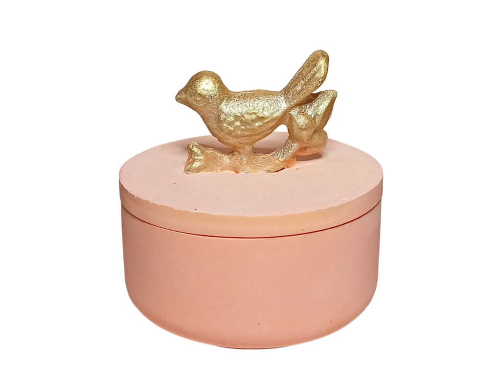 Декоративная шкатулка из бетона светло-оражевого цвета с птичкой. Подойдет для хранения украшений и прочих мелочей.