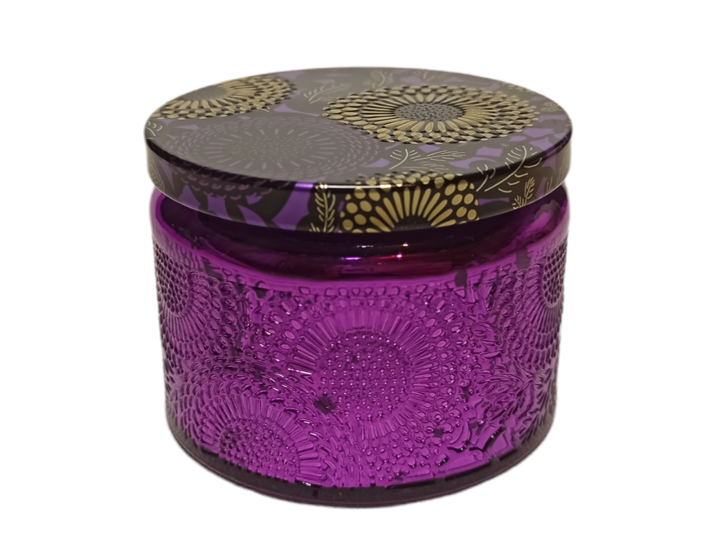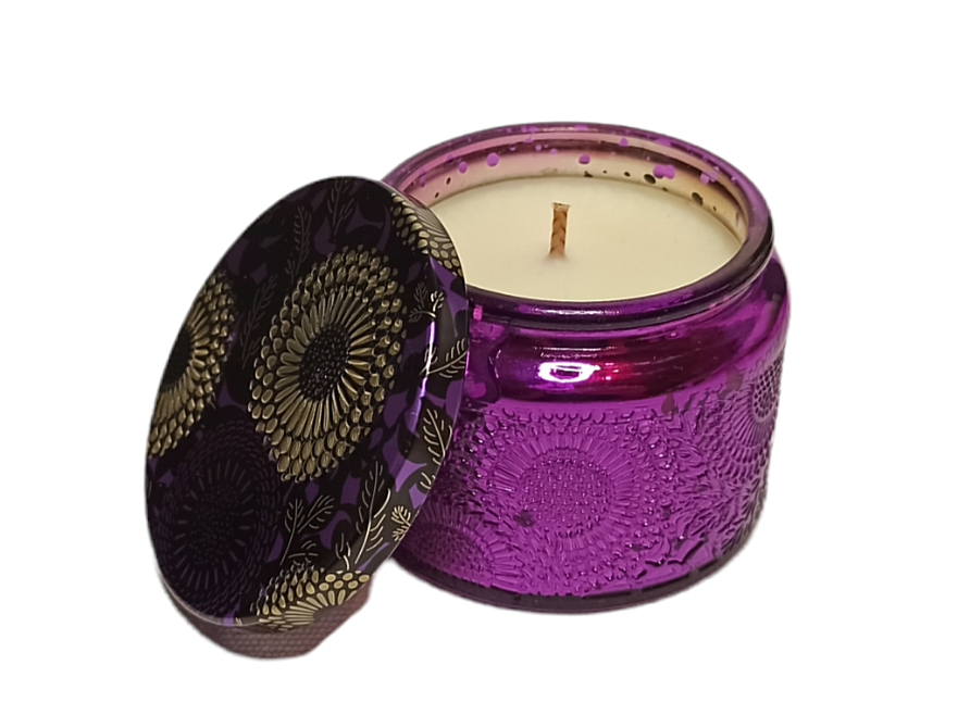 Свеча из соевого воска в дизайнерской, стеклянной банке цвета пурпурной фукции и металлической крышкой с оранментом. Аромат свечи Магнолия. Стойкий аромат со степенью ароматизации 4 по 5 бальной шкале. Подойдет для рабочего стола, кабинета, гостиной.