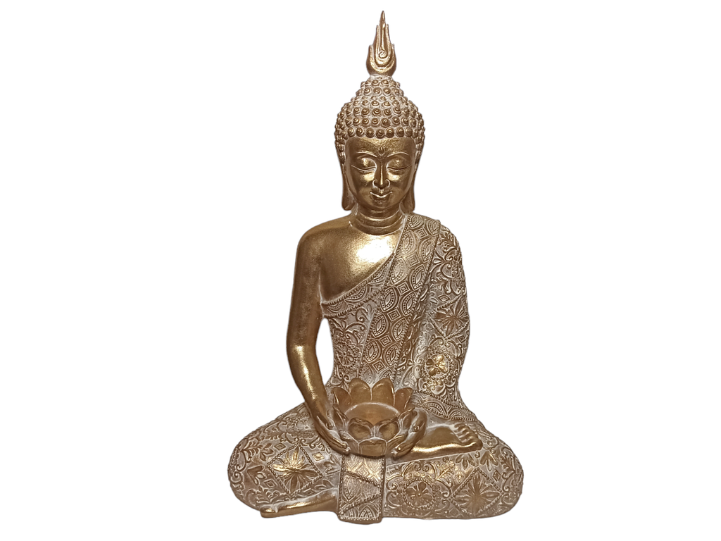 Декор для дома в виде статуэтки золотого Будды, сидящего в позе для медитации, с чашей лотоса в руках. Цвет Будды - золотой с белым налетом.