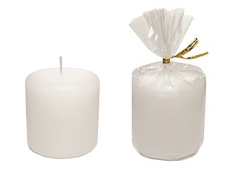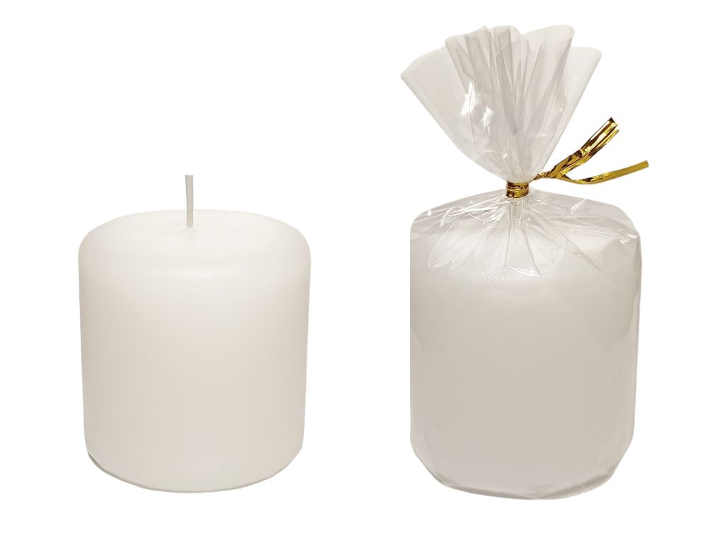 Классическая свеча пеньковый столбик, белого цвета. Упакован в пленку с твист лентой, как на фото.