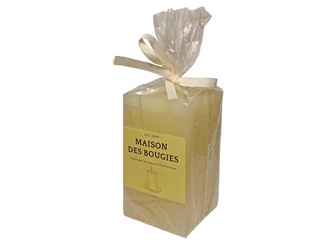 Прямоугольная свеча блок, цвета слоновая кость, с неоднородной, рустикальной поверхностью.