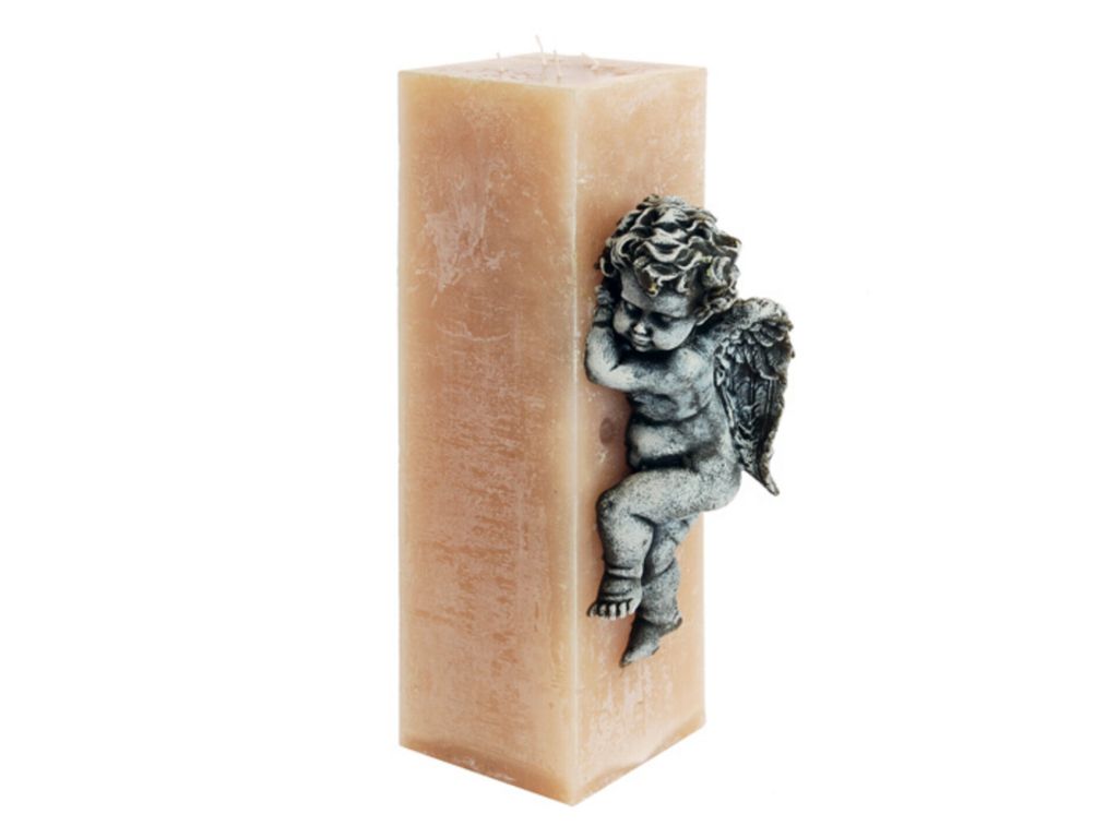 Большая свеча в виде квадратной колонны, высотой 60 см с четырьмя фитилями. Цвет свечи, это микс темной слоновой кости с светло серым оттенком. У свечи фактурная поверхность с неоднородной шершавой поверхностью. С одной из сторон выступающая фигура Ангела, тоже сделанного из парафина серого цвета и заколерованного в белый "солевой" налет. Свеча упакована в большую картонную коробку.