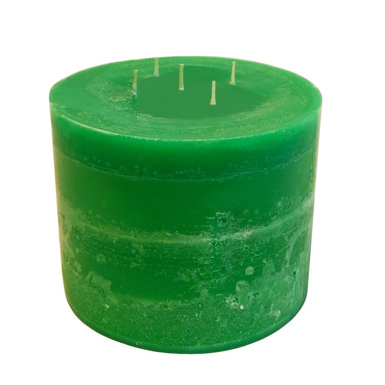 Большая интерьерная свеча зеленого цвета в форме цилиндра с пятью фитилями. Свеча имеет фактурную естетсвенную поверхность со следами заливки слоев свечной массы. Цвет: оттенки зеленого. Вес свечи, примерно 1,850 гр +-50 гр.