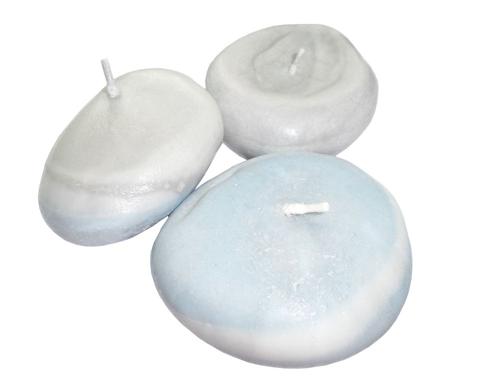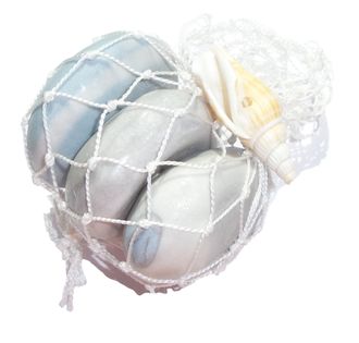 Набор свечей в виде камней -морской гальки, разных форм и размеров, в декоративной морской сетке с ракушкой.