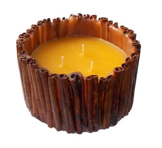 Парафин, стеарин, краситель, ароматизатор, фитиль, фитиледержатель. Декор - кора, палочки кассии и (или) корицы.