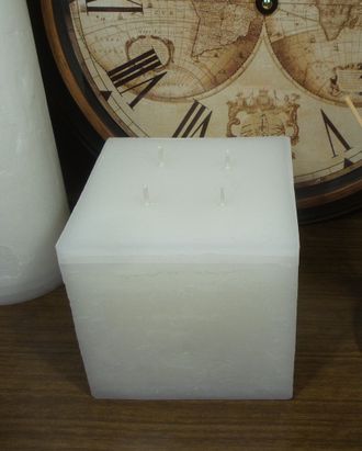 Большая свеча с естественной фактурной поверхностью в форме белого куба с четырьмя фитилями.