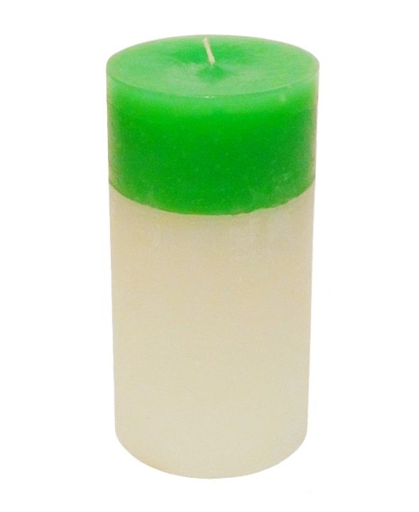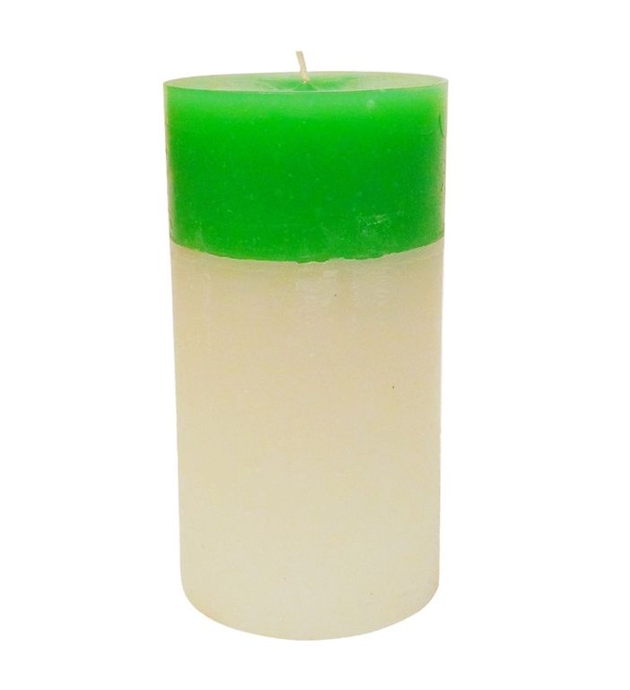 Интерьерная большая свеча в форме цилиндра, состоящая из двух цветных слоев. Нижний цвет белый, верхний цвет зеленый, как на фото.