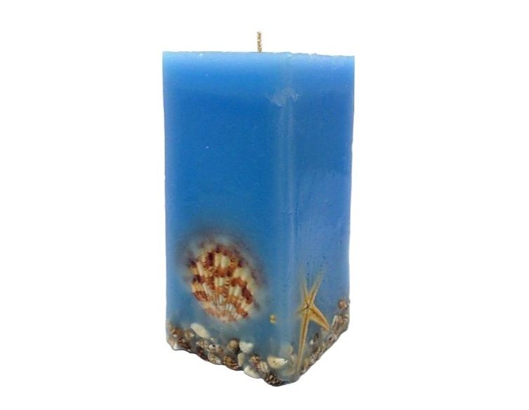 Свеча в виде прямоугольного блока голубого цвета с морскими ракушками и морскими звездами.