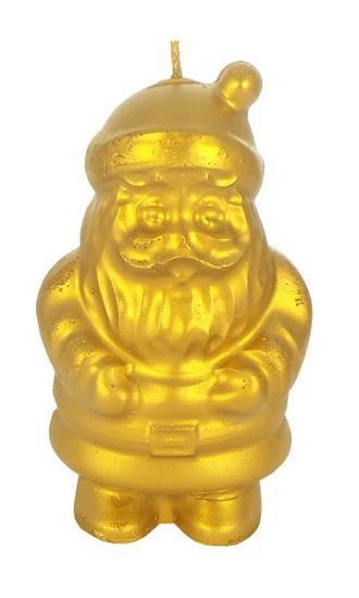 Декоративная фигурная свеча золотого цвета в виде Санта Клауса. Свеча упакована в подарочный, прозрачный пакет с бантиком.