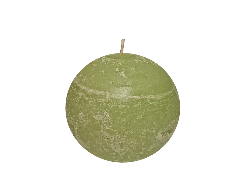 Свеча в форме шара оливкового цвета с рустикальной, неоднородной поверхностью.