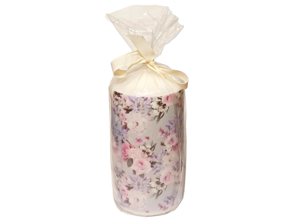 Свеча классический столбик белого цвета с принтом, с изображение цветов на лавандовом фоне. Свеча упакована в полиэтиленовый пакет с бантиком, как на фото.