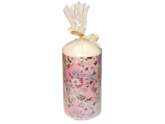 Свеча классический столбик белого цвета с принтом, с изображение цветов на розовом фоне. Свеча упакована в полиэтиленовый пакет с бантиком, как на фото.