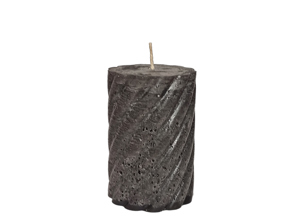 Витая свеча столбик графитового цвета в рустикальном стиле. Обладает фактурной, неоднородной поверхностью. Упаковка индивидуальный пакет.