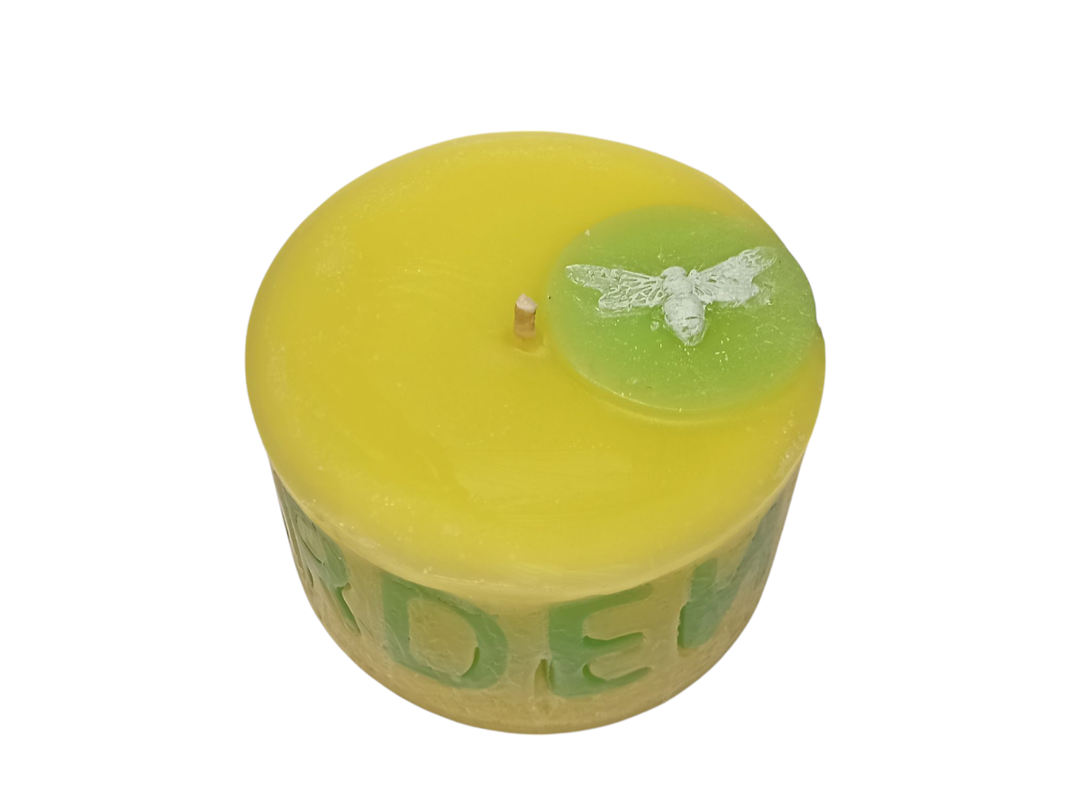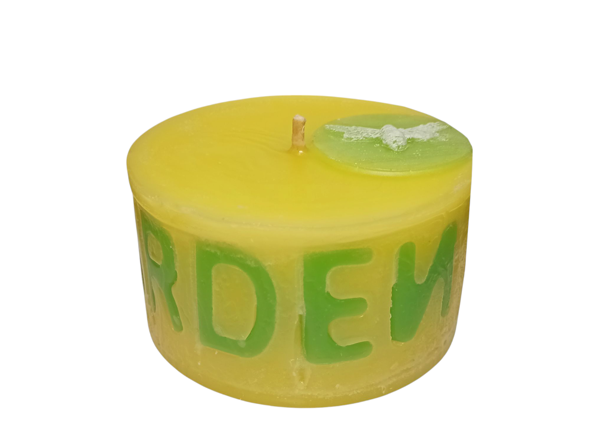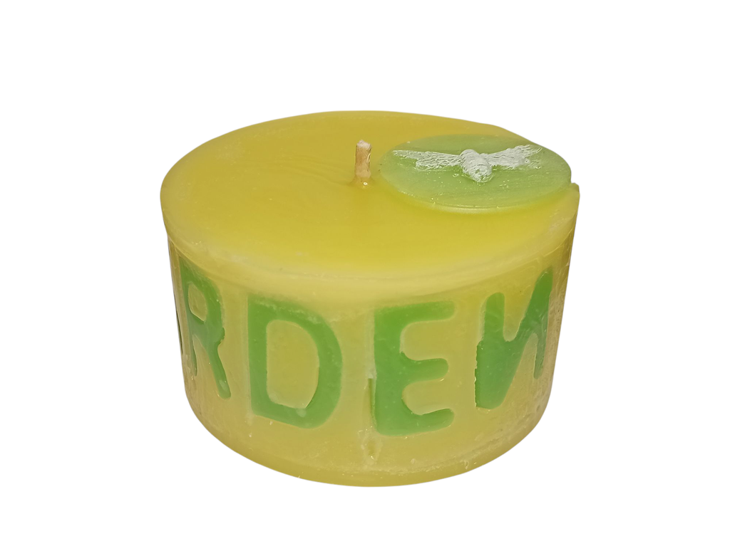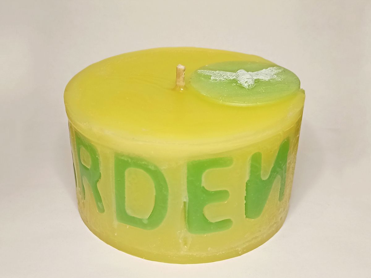 Садовая свеча для использования на улице в рустикальном стиле. Дизайнерская коллекция винтажных свечей для сада, сезона Весна-Лето 2025 года. Свеча желтого цвета с толстым, хлопковым фитилём диаметром 6 мм. По кругу, сбоку свечи, идет надпись Garden, выполненная из парафиновых светло-зелёных букв. Они сгорают так же как и основаня свеча. Сверху свечи круглый, декоративный элемент в виде печати с изображением пчелы, так же выполненный из парафина. Свеча является атрибутом для декора сада, создания садовых уголков с дизайнерскими элементами в эксклюзивном, винтажном стиле. Её, конечно, можно поджигать и любоваться ей, но создавали мы эту ограниченную коллекцию, именно для постоянного элемента декора сада или фотозоны. Время горения 5 часов.