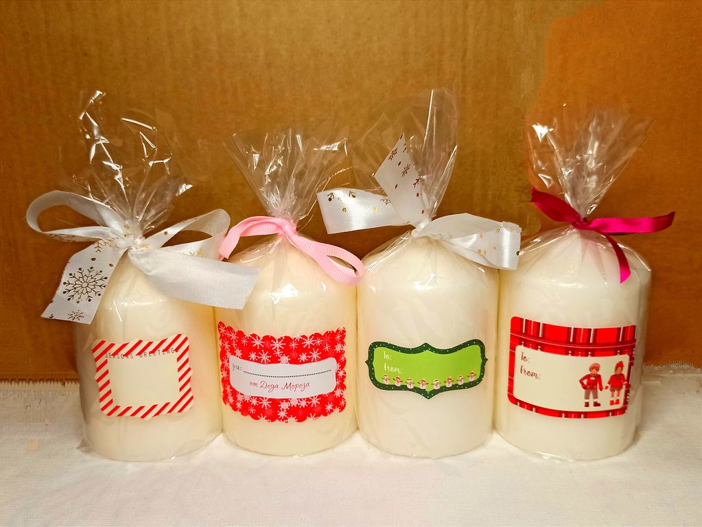Комплект белых свечей столбиков в новогодней упаковке и наклейками для новогоднего подарка или декорирования.