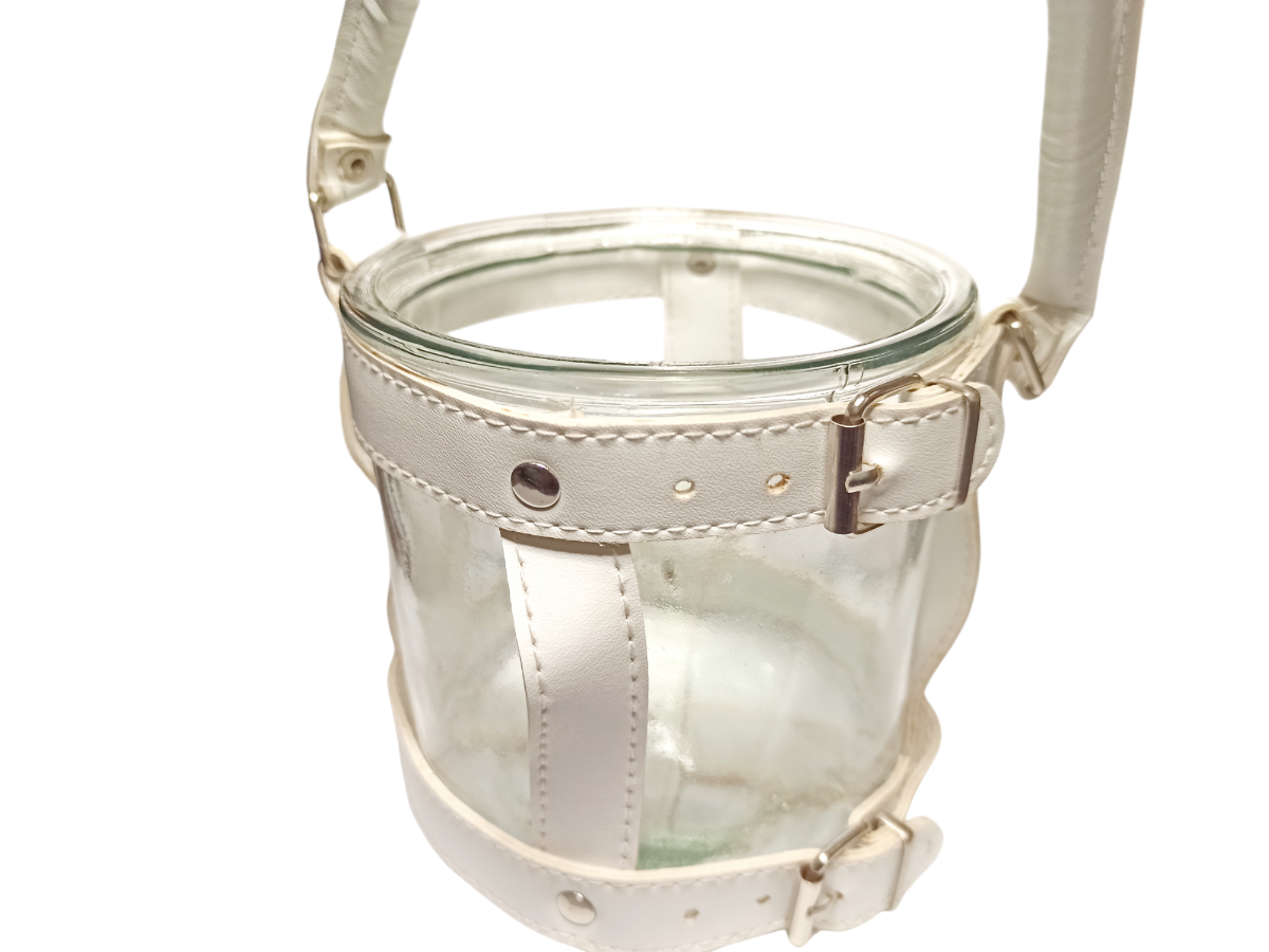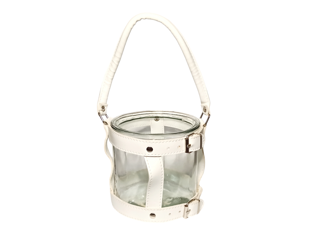 Стеклянная ваза с декором из белых ремешков и ручкой под кожу. Можно использовать как вместе с ремешками, так и достать саму вазу и использовать ее отдельно. Ваза вмещает в себя 500 гр насыпных свечей. Использовать один фитиль по центру. Стильная дизайнерская ваза, подойдет на свадебный стол, для декораций и фотозон. При использовании и с зажженой свечой, опускать ремешой в бок. Может быть использована как интерьерная ваза для мелочей, ваза для живых, срезанных цветов.