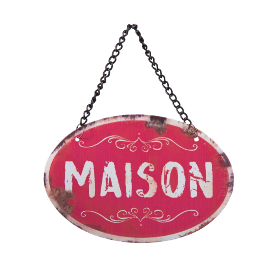 Искусственно состаренная металлическая табличка на цепочке с надписью Maison. В переводе с французского означает - Дом. Подойдет для декора стены, как подвеска на стеллаж или секретер. Так же, можно снять цепочку и прикрутить табличку к входной двери на саморезы или гвоздики. Имеет искусственно созданные потертости и следы ржавчины. Подойдет в помещения, оформленные в стиле "Винтаж", "Прованс", "Европа 18-19 век".