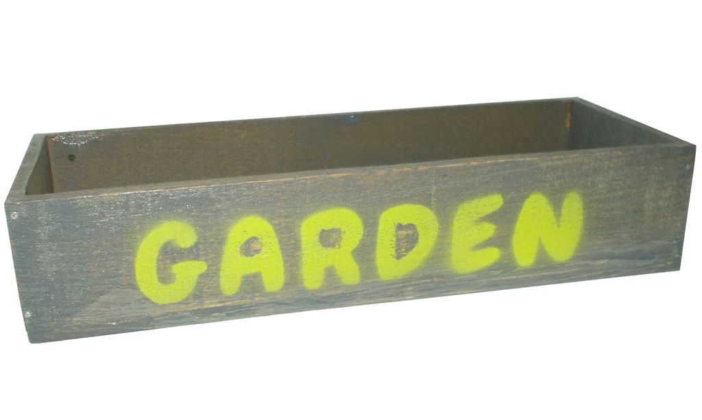 Ящик кашпо в винтажном стиле, серого цвета с светло-зеленой надписью Garden.